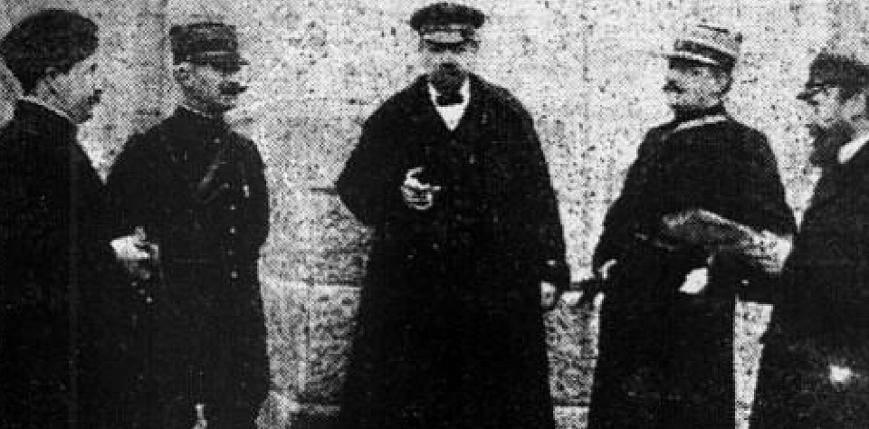 | Deuxième en partant de la gauche, le commandant Bardot du 47e RI à Cancale, encadré à gauche par le commdant de la gendarmerie de Rennes James et le commissaire spécial Gérard de Saint-Malo. Cliché publié en une de L'Ouest-Eclair le 7 mars 1911. Archives Ouest-France. |