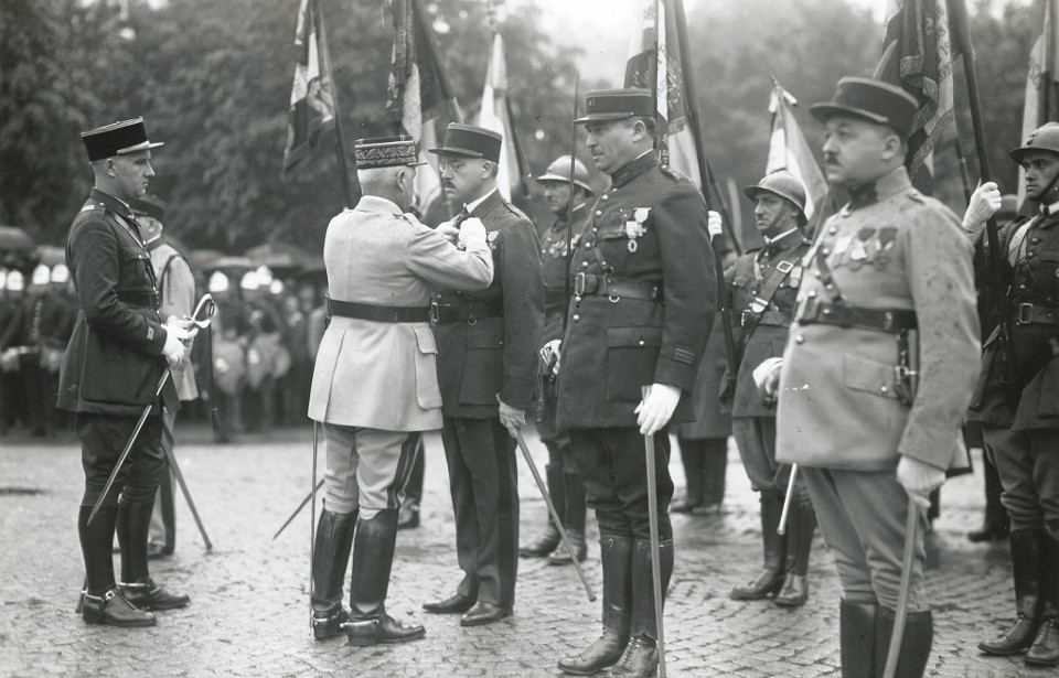 | Alfred Burckhardsmeyer, au centre sur le cliché, en novembre 1918, lors d'une remise de décoration par le maréchal Pétain. Archives privées famille Burckhardsmeyer. |