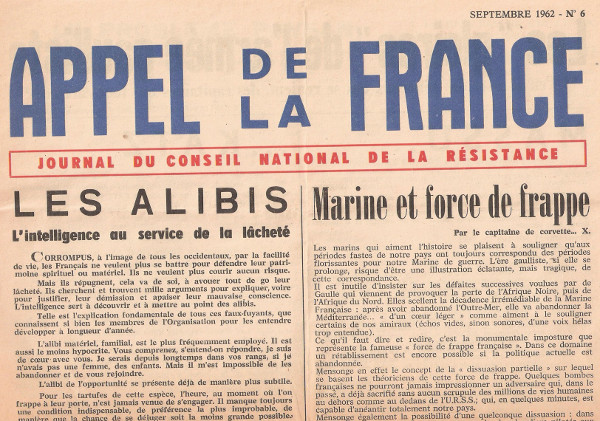 | Appel de la France: le journal de l'OAS n'hésite pas à recycler le vocabulaire de l'Armée des ombres. Collection particulière. |