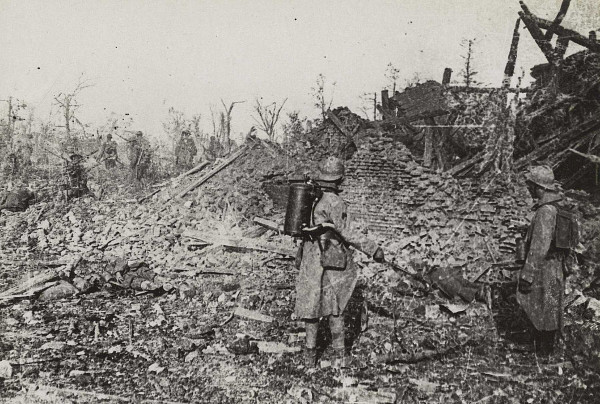 | Dans le secteur de Cantigny: soldats américains et français progressant, le 28 mai 1918. BDIC: VAL 420/042. |