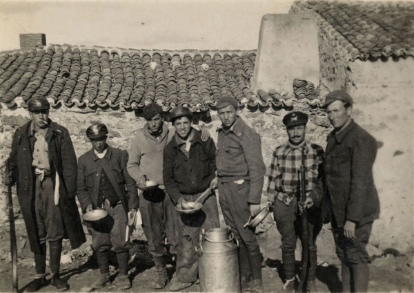 Une partie des membres de la 185th Spanish Labour Company avec les officiers britanniques. Assis au premier rang - 1er à partir de la gauche : le pilote Miguel Galindo Saura ; 5e: le lieutenant Joaquín Ferrandiz Boj, commandant espagnol de la compagnie ; 7e: le capitaine Smith, commandant de la compagnie ; 8e: le lieutenant Legrand, adjoint du capitaine Smith. Collection Jesús Galindo Sánchez |
