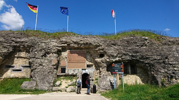 Ces touristes représentent un groupe social hétéroclite, qui se compose d’anciens combattants, de pèlerins, de curieux, aussi bien Français qu’Allemands23. Erich Maria Remarque nous laisse d’ailleurs le récit d’une visite au fort de Douaumont vers 1926, dans la nouvelle Retour à Douaumont, qui commence ainsi : « La route ne va pas plus loin. La voiture s’immobilise dans un crissement de freins ; nous nous en extirpons, et nous retrouvons sur une sorte de place du marché. Des véhicules se garent, des chauffeurs inquiets attendent, vivante image du zèle avec leurs casquettes à visières ; des troupeaux de gens se rassemblent et se mettent en formation, des guides cherchent leurs brebis, et donnent le signal du départ. Autour de nous, dans des chuchotements hâtifs, les hommes font diligemment leurs affaires ; les chemins de mort sont devenus des boulevards pour respectables touristes ; là où chaque pas était autrefois synonyme de sang, de souffle coupé, de peur qui vous prenait à la gorge, passent désormais des chemins pavés de bois où les visiteurs, cornaqués par des interprètes chevronnés, pourront tout voir sans salir leurs chaussures – spectacle intégral garanti. Douaumont. »24 Plus loin, il explique que les visites sont faites à la lampe à acétylène et laisse entendre qu’elles sont faites en plusieurs langues ; le français, l’anglais, et sans doute aussi l’allemand. La figure de Douaumont, le Sargdeckel25 des Allemands, qui est resté un traumatisme dans la mémoire collective outre-Rhin après avoir furtivement pris les aspects d’une grande victoire, sert surtout à l’auteur à souligner, non sans ironie, le décalage qui existe entre les visites touristiques d’après-guerre et la réalité de l’expérience combattante vécue par les soldats sur le terrain. Dès cette époque, les forts sont les lieux privilégiés de ce « chevauchement des mémoires »26.