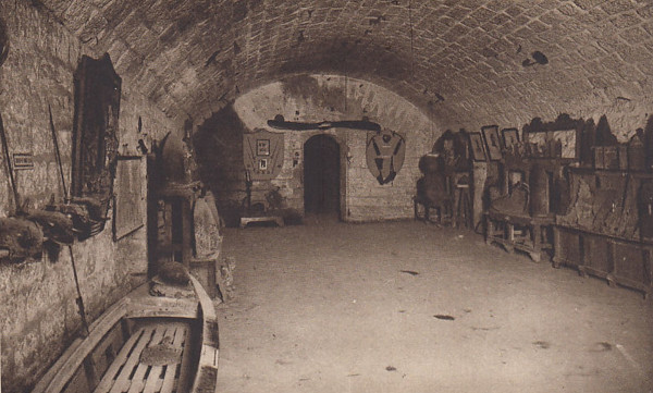 Mais qu’est-ce que l’intérieur de ces forts offre à voir aux visiteurs qui ont l’audace d’y pénétrer, au-delà de la vie de garnison quotidienne ? Il y a très peu de témoignages à ce sujet, mais une photo intéressante conservée à La Contemporaine, nous en donne une idée. Sur ce cliché, on peut voir une pièce (parmi les rares de ce bâtiment à être en bon état en 1918, sans doute dans une des chambrées de l’abris-caverne, voire dans la tourelle annexe) nommée par une pancarte « Musée du fort de Souville ». Celle-ci sert à exposer des objets dont certains sont visibles : un casque allemand « Stahlhelm » en assez mauvais état16, une pile de culots d’obus, sans doute du calibre 42 cm allemand (canons « Grosse Bertha »17) dont le fort a été copieusement arrosé18, et ce qui semble être un imposant fragment d’obus de très gros calibre19. La pièce accueillant ce musée est manifestement un bureau encore en activité, et l’exposition ne semble en occuper qu’une petite superficie. Celle-ci doit-elle être comprise comme un espace de tradition, au sens militaire du terme, ce qui ferait écho à l’esprit de corps de la garnison, ou bien plutôt comme un lieu destiné à prouver aux très nombreux visiteurs du fort sa résistance, et a fortiori celle de l’armée française à Verdun. C’est sans doute la seconde hypothèse qui est la plus proche de la réalité20, et qui nous conduit directement à la « muséification » des forts, et aux premières visites touristiques en tant que telles, après la guerre.