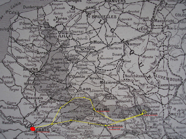 La Société « Les auto-mails »15 lui fait une proposition de voyage de groupe, qu’il accepte, incluant : les visites guidées, les repas, les nuitées d’hôtels, le transport en voiture de quinze places et les services d’un chauffeur et d’un guide16, tous deux anciens combattants comme c’était souvent le cas après la guerre. Les participants sont des ressortissants français et de pays neutres mus par des motivations spécifiques ; parmi eux : une famille parisienne (le mari, sa femme et sa fillette de douze ans) curieuse de voir les lieux dont la presse a rendu compte tout au long de la guerre, deux Espagnols (un gendre et son beau-frère), quatre Français expatriés de longue date au Mexique et soucieux de visiter les départements ravagés, une ancienne infirmière de la Croix-Rouge souhaitant connaître les fronts où elle n’est pas allée et une commerçante française établie à Barcelone, férue d’ascension et tentée par les sommets de guerre. Les étapes, l’hébergement et les repas sont prévus à l’avance car les infrastructures d’accueil sont encore rares. L’itinéraire au départ de Paris prévoit de relier : Paris à Reims le premier jour, en passant par Soissons ; Verdun le lendemain, avec au passage la visite de la cathédrale, du fort de la Pompelle et un arrêt sur le chemin des Dames et à Berry-au-Bac ; un bref tour de ville le troisième matin, suivi de la visite du fort de Vaux, de l’ossuaire, de la tranchée des fusils, de la cagna du Kronprinz avant de gagner Châlons ; et, le dernier jour, une promenade et un déjeuner à Château-Thierry avant de regagner Paris.
