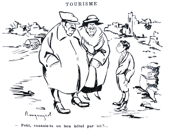 Le front est un espace sacré, sacralisé par le sang versé, aux yeux de ceux qui ont combattu ou ont perdu un proche. Ce sentiment est d’autant plus fort que sur les 9 à 10 millions de morts de la guerre, un nombre considérable est porté disparu et se retrouve sans sépulture, leur corps n’ayant jamais été retrouvé46. Le sacrifice des soldats tombés les armes à la main doit nécessairement susciter le respect et par extension les lieux eux-mêmes. La Revue du Touring-club de France et son équivalent britannique, la Traveller’s Gazette47,publient dès 1919 des impressions de voyage et des récits de pèlerins qui entretiennent une certaine sacralisation, mais aussi des lettres de contestation à l’encontre des touristes irrévérencieux. Certaines dénoncent « cette foule des désoeuvrés ou des snobs qui vont là comme ils iraient aux courses », leur nature gouailleuse et turbulente, leur attitude impudique48. D’autres critiquent la curiosité déplacée de ces personnes qui, « arrivant par le train pour jeter un coup d’œil sur les pierres noircies qui rappellent encore le passage des Allemands», se soucient rarement de l’intérêt historique de la ville, et traversent ensuite la grande rue détruite par l’invasion, tandis que le reste leur échappe49. L’ignorance des touristes, leur grossièreté, leur incorrection, leur attitude blasphématoire sont fréquemment soulignées50. Les explications ne manquent pas - l’absence d’empathie, d’aménagements, le décalage entre le site, ce qu’il évoque et ce que les non initiés peuvent ressentir - ; les solutions non plus - les sensibiliser, leur enseigner la beauté des ruines, les confronter à la parole des témoins, du poilu mutilé qui s’est battu pendant des mois dans les tranchées que l’on visite, ou du civil du pays, victime perpétuelle. En attendant, des mesures sont prises localement pour permettre des visites en toute quiétude. Ainsi au début de l’année 1921, à Berry-au-Bac sur la cote 108, certains excursionnistes ayant fait preuve d’un manque de tact en manifestant bruyamment leur joie de vivre là où des soldats avaient combattu, des écriteaux sont posés appelant à des comportements de convenance51. L’un, placé à l’entrée ordonne désormais : « Visiteurs ! Respectez ces lieux où de nombreux soldats sont morts pour la Patrie », l’autre à mi-chemin entre les deux cratères rappelle : « Que votre visite soit, pour les héros qui tombèrent en ces lieux, un hommage respectueux rendu à leur mémoire ». Des instructions sont également données à la police afin qu’elle rappelle à l’ordre les visiteurs (surveillance des sites, délimitation d’un périmètre, pose de barbelés, etc.). Les pèlerins redoutent en même temps la commercialisation des lieux. Elle se manifeste principalement par la vente d’objets et de trophées. Sur de nombreux sites, des débris, des chaussures, des masques asphyxiants, des gourdes, des obus, tout un fouillis d'objets disparates réunis en tas ou épars jonchent encore le sol et sont à portée de main. À Ypres, des souvenirs manufacturés sont en vente dans les magasins et des enfants proposent des armes rouillées, des casques, des grenades, des boutons d’uniformes52. Sur les champs de bataille autour de Verdun, des touristes emportent des os ou des crânes, des ferrailleurs collectent le cuivre et l’acier53. Un écriteau renversé au bord du chemin rappelle pourtant : « Passants, ne vous écartez pas des routes. Le champ de bataille doit rester intact. Ne prenez rien. Chaque motte de terre recouvre une sépulture. Ne la profanez pas »54. Des voix s’élèvent aussi parmi les sociétaires du Touring-club contre la profanation des ruines : à Reims par exemple, le parvis de la cathédrale est devenu un véritable marché forain55 où se côtoient les auto-cars, garés au pied de la cathédrale, les gravats et les baraquements de souvenirs et de cartes postales. Mais le front est aussi un espace de vie pour les civils restés ou rentrés précocement sans attendre les autorisations administratives. Ces autochtones échappent au débat pèlerin / touriste, espace sacré / espace profane. Avant tout préoccupés par un quotidien à rebâtir, les habitants de régions sinistrées sont partagés sur le bénéfice qu’ils peuvent tirer de cet afflux de personnes. Les caricatures parues dans Le progrès civique, hebdomadaire de gauche de tendance radicale et socialiste fondé par Henri Dumay en 1919, résument assez justement les griefs à l’encontre de tous ces visiteurs indésirables. Chaque numéro comporte en général deux à trois dessins de presse, et les contrées dévastées n’échappent pas à la plume des caricaturistes. Rouquayrol, Raoul Guérin et Raymond Pallier sont de ceux qui, au début des années 1920, dénoncent la situation dans ces régions56.