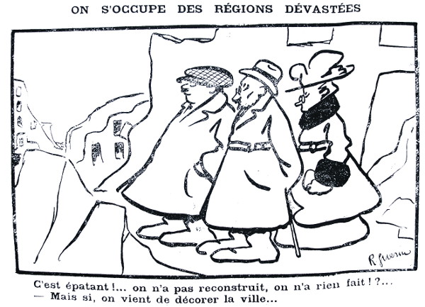 D’un point de vue iconographique, le touriste apparaît toujours vêtu à la dernière mode, rarement seul, le plus souvent en couple ou en groupe. Sa représentation met en avant sans équivoque un sentiment d’aisance, de suffisance. Le contraste est net avec les habitants des pays dévastés, souvent habillés en guenilles, mais ne se réduit pas pour autant au vestimentaire. Il est aussi physique : à l’embonpoint des uns, répond la maigreur des autres, et encore psychologique : soulignant le décalage entre ce que les uns voient et ce que les autres veulent, rappelant le fossé avant-arrière qui séparait déjà pendant la guerre les combattants et les habitants des zones occupées, de ceux vivant hors des zones bouleversées. Notons que la figure du pèlerin est peu présente dans ces caricatures et que la dénonciation porte avant tout sur la dureté de la vie quotidienne dans les zones désormais accessibles. Les ruines sont un simple élément de décor qui permet d’identifier immédiatement les régions dévastées. Ces caricatures sont là pour dénoncer certes la venue des touristes au milieu des ruines – mais surtout pour soutenir la cause des habitants des régions libérées qui souffrent au quotidien de la pénurie de produits de base et des lenteurs administratives. Elles sont un appel à ne pas oublier les sinistrés. La critique porte aussi sur les officiels qui viennent décorer de la Légion d’honneur ou de la Croix de guerre57 les villes et villages martyrs qui ont souffert, se sont battus, ou ont résisté comme des soldats. Elles pointent donc plutôt du doigt la dichotomie affectant les pèlerins et les autochtones.