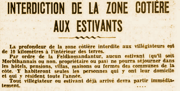 Des loisirs estivaux réservés à l’occupant ? Le 21 octobre 1941, l'armée occupante déclare la zone côtière interdite. Désormais, cette mesure s’applique à tous les civils. Seuls les résidents peuvent s'y rendre, les autres doivent impérativement obtenir un Ausweis. Avec la construction du « Mur de l'Atlantique » à partir de 1942, il n'est plus question pour les estivants d'accéder aux plages du Morbihan. A de rares exceptions, le tourisme se restreint dès lors à l'intérieur du département. Profiter des plaisirs morbihannais : l’exemple du centre de repos d’Arzon La militarisation du littoral ne provoque pas de changements majeurs dans les pratiques touristiques de l’occupant. Les visites du département sont toujours autant prisées. Pour faciliter probablement les excursions de ses cadres présents pour les besoins du programme Atlantikwall, l'Organisation Todt publie un guide historique de la Bretagne composé de 49 pages. Comme celui publié en 1940, il est agrémenté d'illustrations suggérant quelques sites remarquables : les menhirs de Carnac et les poutres sculptées de la cité médiévale de Malestroit en ce qui concerne le Morbihan70. Son calme est particulièrement recherché par les soldats qui reviennent du front. C'est ainsi qu'en 1943, des soldats séjournent à Hennebont au retour des campagnes de Russie et d'Afrique71.