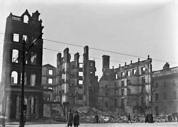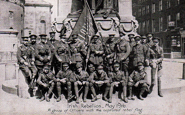 L’Insurrection de Pâques 1916 Le nationalisme séparatiste irlandais mûrit au fur et à mesure de la progression de la guerre. Une campagne désastreuse à Gallipoli en 1915 a causé de nombreuses victimes au sein des unités irlandaises, alimentant le ressentiment. Pâques en Irlande Partout en Irlande, un petit mais influent contingent des Irish Volunteers, ostensiblement dirigé par Eoin MacNeill, refuse l’enrôlement dans l’armée britannique et insiste sur le fait que de lutter pour l’Irlande n’implique pas le service à l’étranger. Les dirigeants de l’Irish Republican Brotherhood, qui avaient infiltré les postes clés des Volunteers, sont d’accord. Le lundi de Pâques, 24 avril 1916, un petit contingent d’environ 1 500 personnes issues des Irish Volunteers, de l’Irish Citizen Army, et des Cumman na mBan (une organisation paramilitaire d’Irlandaises républicaines), occupe des positions symboliques dans la ville de Dublin et proclame la République d’Irlande. Les rebelles tiennent leurs positions pendant presque la semaine entière, jusqu’à ce que les bombardements de l’artillerie britannique, et les incendies résultant, ainsi que la perspective de davantage de morts civils poussent Padraig Pearse, commandant en chef des forces rebelles, à se rendre.